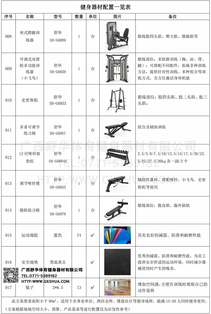 此方案要求面积小于90m²,适用于企事业单位、酒店会所、楼盘社区等健身场所,能满15-20人同时健身使用。(方案根据场地空间大小、预算、产品需求等进行配置仅为启发性参考)