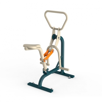 在座板上坐定,手握扶手,脚踩踏板,作双臂伸缩运动