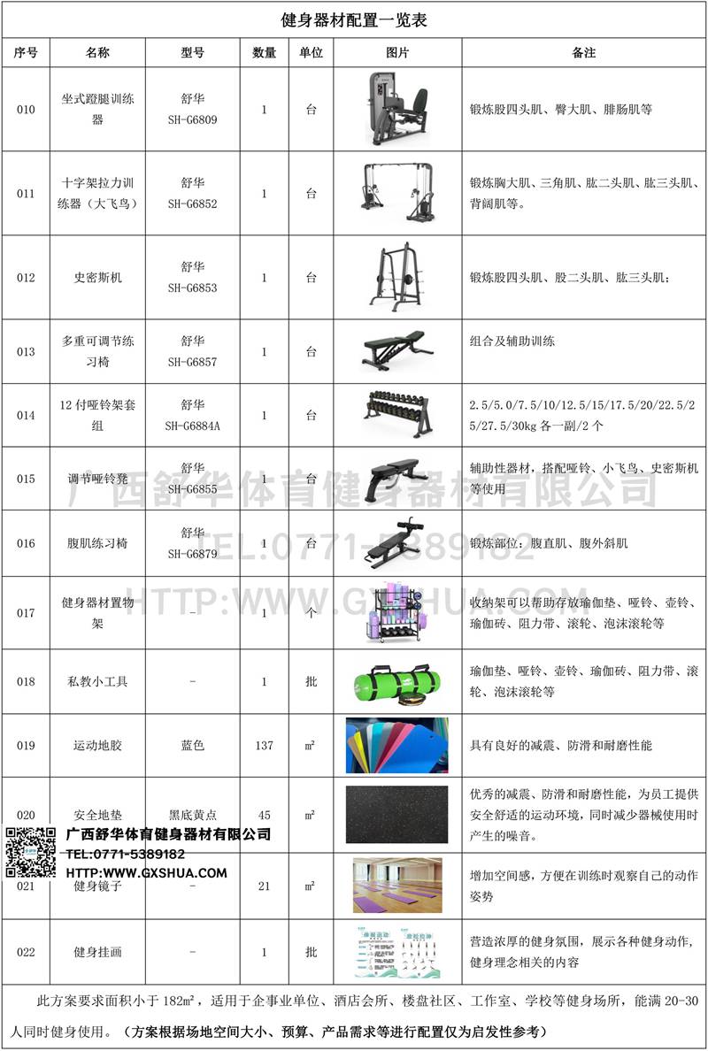 此方案要求面积小于182m²,适用于企事业单位、酒店会所、楼盘社区、工作室、学校等健身场所,能满20-30人同时健身使用。(方案根据场地空间大小、预算、产品需求等进行配置仅为启发性参考)