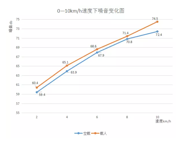 在空载情况下,当速度达到10㎞/h,检测的大噪音为72.4db,而载人(62kg)时,速度在8㎞/h,噪音就达到了70db以上。所以,载人与否对于噪音的影响并不大。